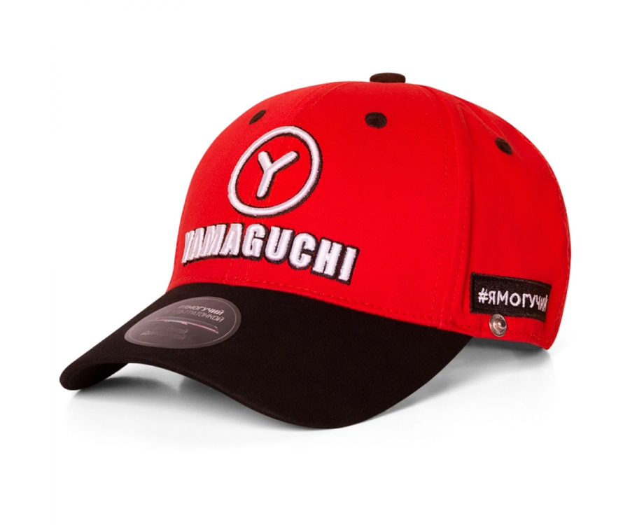 Бейсболка сшита из тканей фирменных цветов бренда Yamaguchi, черного и красного, снабжена крупной нашивкой с именем компании, не отличается от классических спортивных головных уборов: тулья высокая, а козырёк длинный.